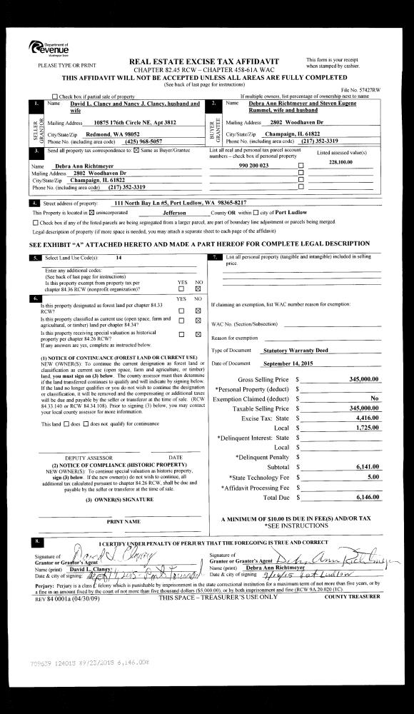 | 1 | 09/14/2015 | SWD | Statutory Warranty Deed | DAVID L & NANCY J CLANCY | DEBRA RICHTMEYER & STEVEN RUMMEL | | | $345,000.00 | 124015 | |