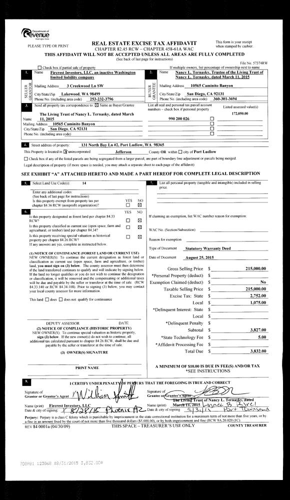 | 2 | 08/25/2015 | SWD | Statutory Warranty Deed | FIRCREST INVESTORS LLC | NANCY TERNASKY LIVING TRUST | | | $215,000.00 | 123868 | |