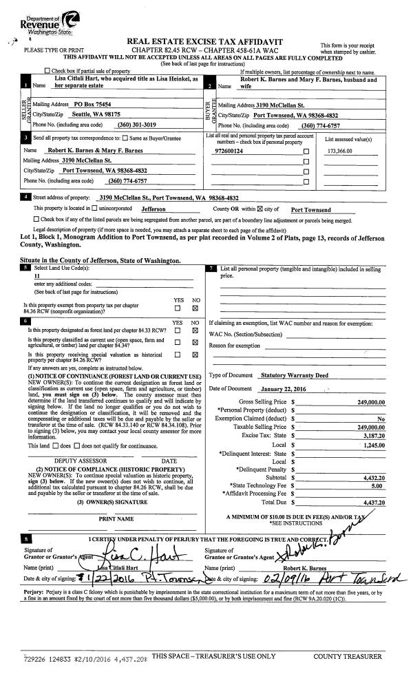 | 2 | 03/29/2016 | SWD | Statutory Warranty Deed | JACK S ENG | WILLIAM J MARLEY | | | $260,000.00 | 125114 | |