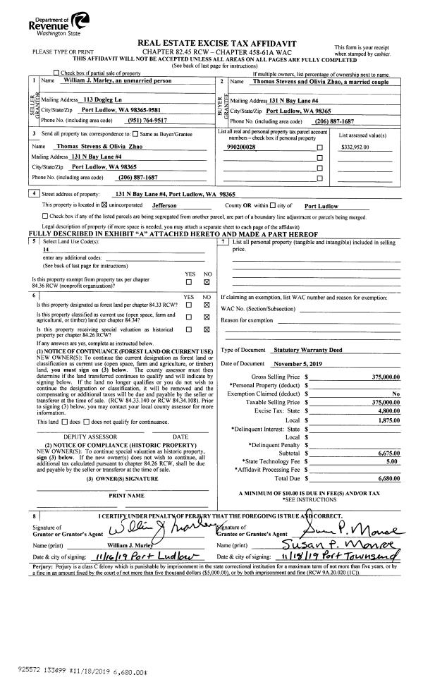 | 1 | 11/05/2019 | SWD | Statutory Warranty Deed | WILLIAM J MARLEY | THOMAS STEVENS & OLIVIA ZHAO | | | $375,000.00 | 133499 | |