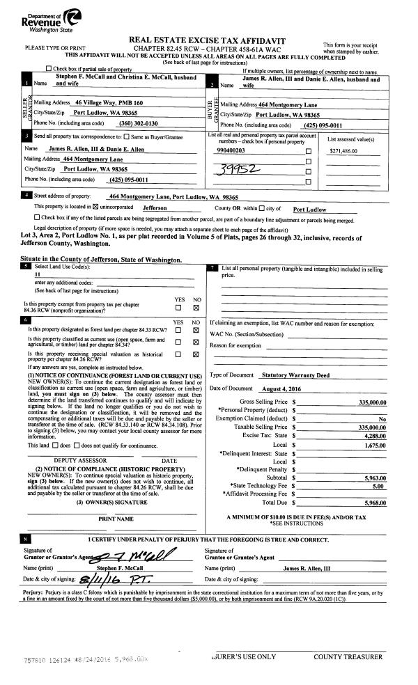 | 2 | 08/04/2016 | SWD | Statutory Warranty Deed | STEPHEN F MCCALL | JAMES ALLEN III & DANIE ALLEN | | | $335,000.00 | 126124 | |