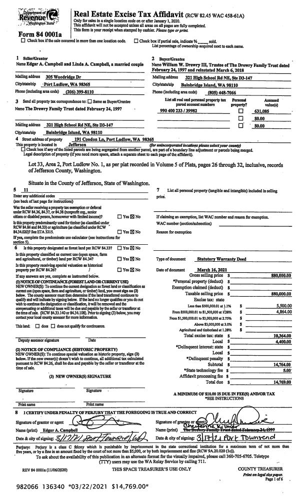 | 1 | 03/16/2021 | SWD | Statutory Warranty Deed | EDGAR & LINDA CAMPBELL | DREWRY FAMILY TRUST | | | $880,000.00 | 136340 | |