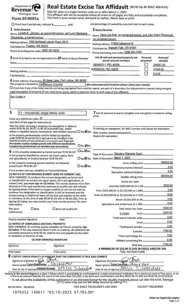 | 1 | 03/01/2023 | SWD | Statutory Warranty Deed | LENETTA E JOHNSON | DANA L RUTZ | | | $485,000.00 | 140611 | |