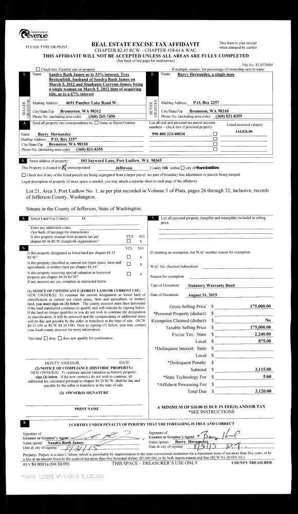 | 4 | 08/31/2015 | SWD | Statutory Warranty Deed | SANDRA R JAMES | BARRY HERNANDEZ | | | $175,000.00 | 123892 | |