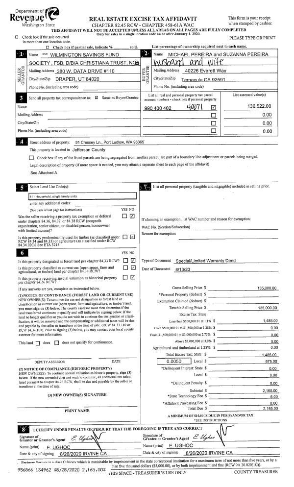 | 3 | 08/13/2020 | SPWD | Special Warranty Deed | WILMINGTON SAVINGS FUND SOCIETY | MICHAEL & SUZANNA PEREIRA | | | $135,000.00 | 134962 | |