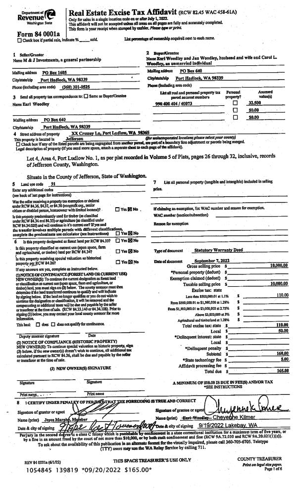 | 1 | 09/07/2022 | SWD | Statutory Warranty Deed | M & J INVESTMENTS | EARL & JAN WOODLEY | | | $10,000.00 | 139819 | |
