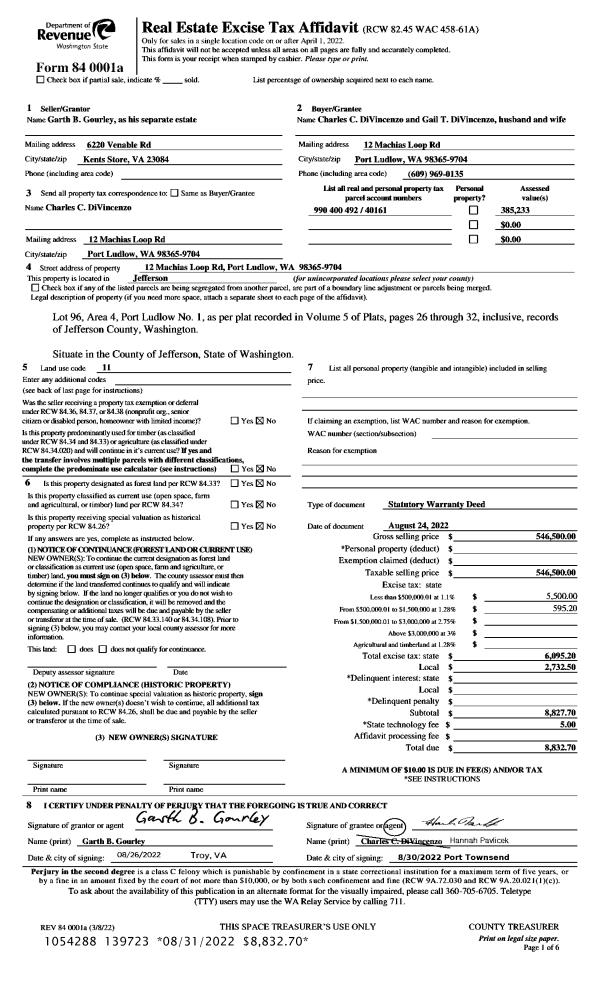 | 1 | 08/24/2022 | SWD | Statutory Warranty Deed | GARTH B GOURLEY | CHARLES C & GAIL T DIVINCENZO | | | $546,500.00 | 139723 | |