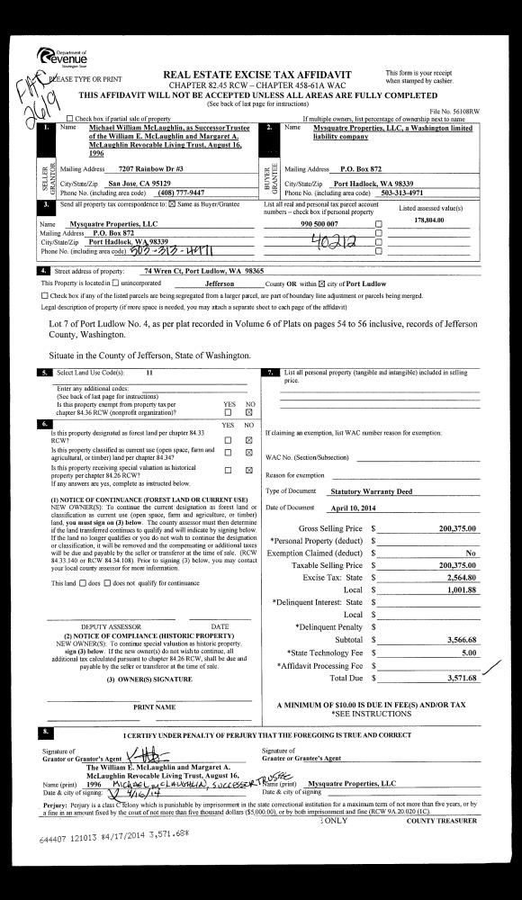 | 1 | 04/10/2014 | SWD | Statutory Warranty Deed | MC LAUGHLIN TRUSTEE WILLIAM E | MYSQUATRE PROPERTIES LLC | | | $200,375.00 | 121013 | |