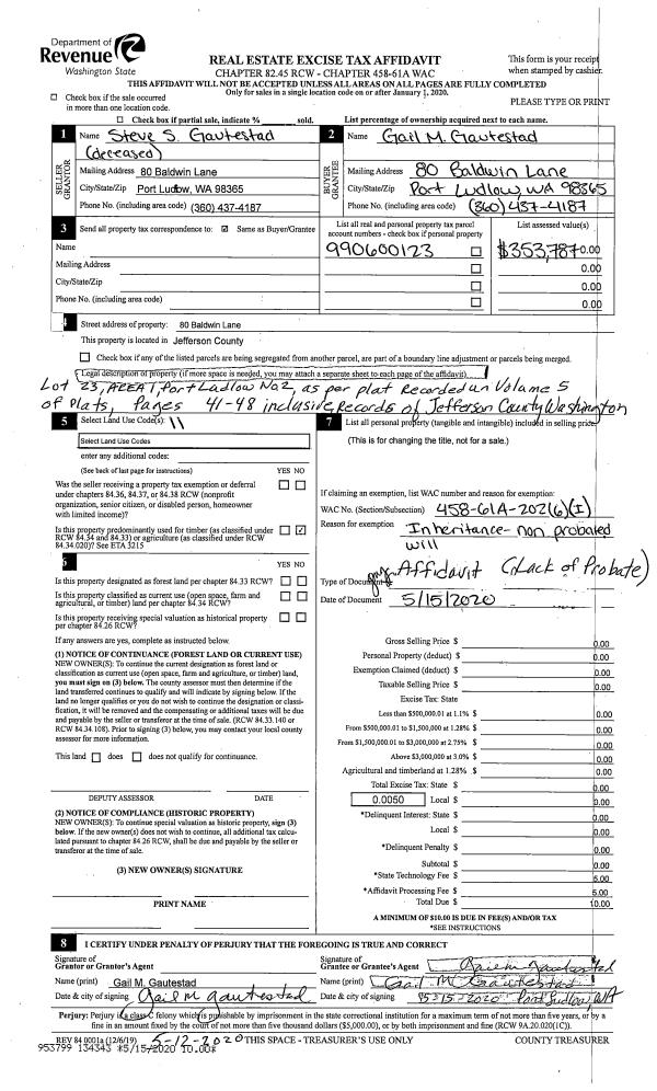 | 1 | 05/15/2020 | LOP | Lack of Probate | STEVE S GAUTESTAD | GAIL M GAUTESTAD | | | | 134343 | |