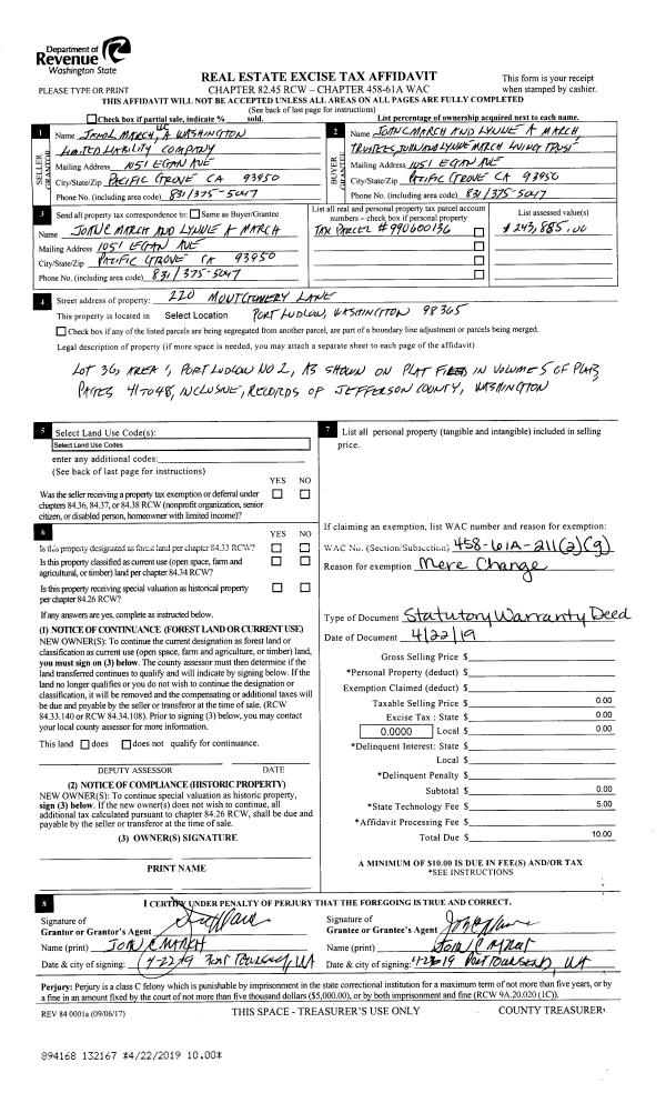 | 3 | 04/22/2019 | SWD | Statutory Warranty Deed | J & L MARCH LLC | MARCH LIVING TRUST | | | | 132167 | |