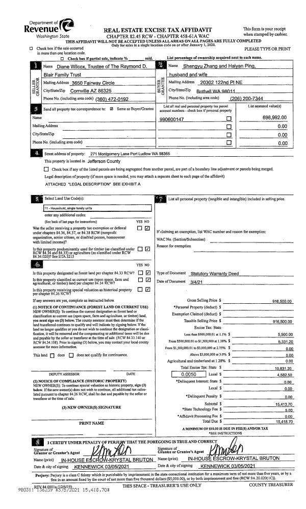 | 1 | 03/04/2021 | SWD | Statutory Warranty Deed | DWAYNE WILCOX | SHENGYU ZHANG & HAIYAN PING | | | $916,500.00 | 136239 | |