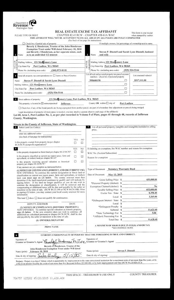 | 1 | 05/13/2015 | SWD | Statutory Warranty Deed | BEVERLY J HENDERSON | STEVEN P & SARAH L DINSTELL | | | $653,000.00 | 123202 | |