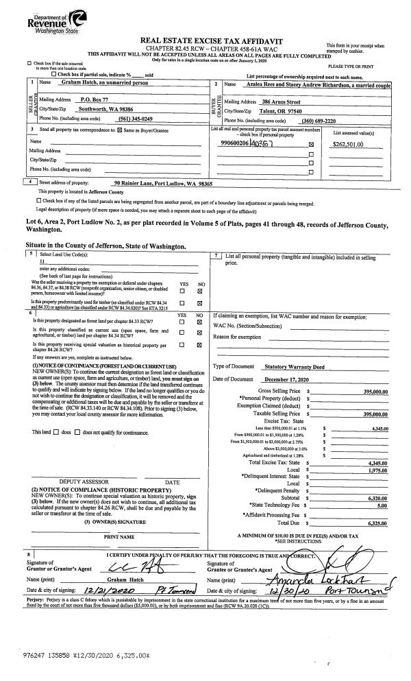 | 1 | 12/17/2020 | SWD | Statutory Warranty Deed | GRAHAM HATCH | AZALEA REES & STACEY RICHARDSON | | | $395,000.00 | 135858 | |