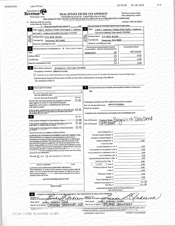 | 3 | 01/29/2020 | TRED | Trustee Deed | EUGENE & LINDA ANDERSON REVOCABLE TRUST | LINDA L ANDERSON SURVIVORS MARITAL TRUST | | | | 133952 | |