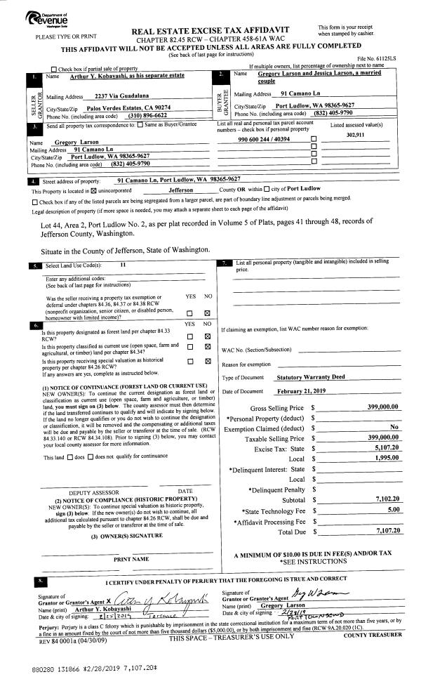 | 1 | 02/21/2019 | SWD | Statutory Warranty Deed | ARTHUR Y KOBAYASHI | GREGORY & JESSICA LARSON | | | $399,000.00 | 131866 | |