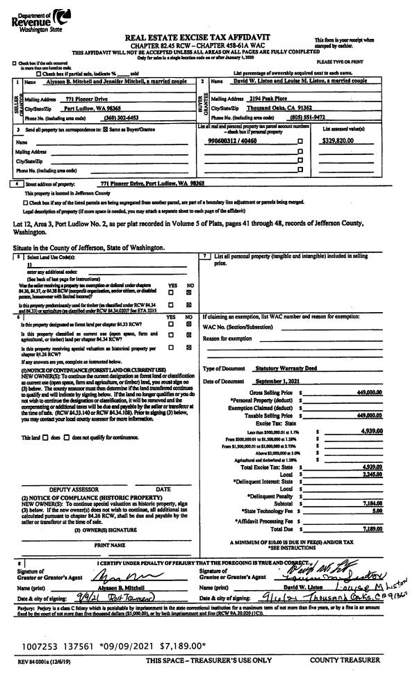| 1 | 08/01/2021 | SWD | Statutory Warranty Deed | ALYASON B MITCHELL & JENNIFER MITCHELL | DAVID W & LOUISE M LISTON | | | $449,000.00 | 137561 | |