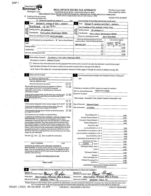 | 1 | 07/17/2020 | WD | Warranty Deed | MICHAEL R & GAIL L JACKSON | JACKSON LIVING TRUST | | | | 134821 | |