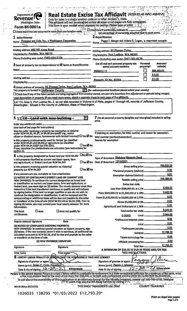 | 2 | 12/15/2021 | SWD | Statutory Warranty Deed | FERGUSON & COLE INC | PEGGY J MEZGER & ARLENE E LOGAN | | | $769,000.00 | 138295 | |