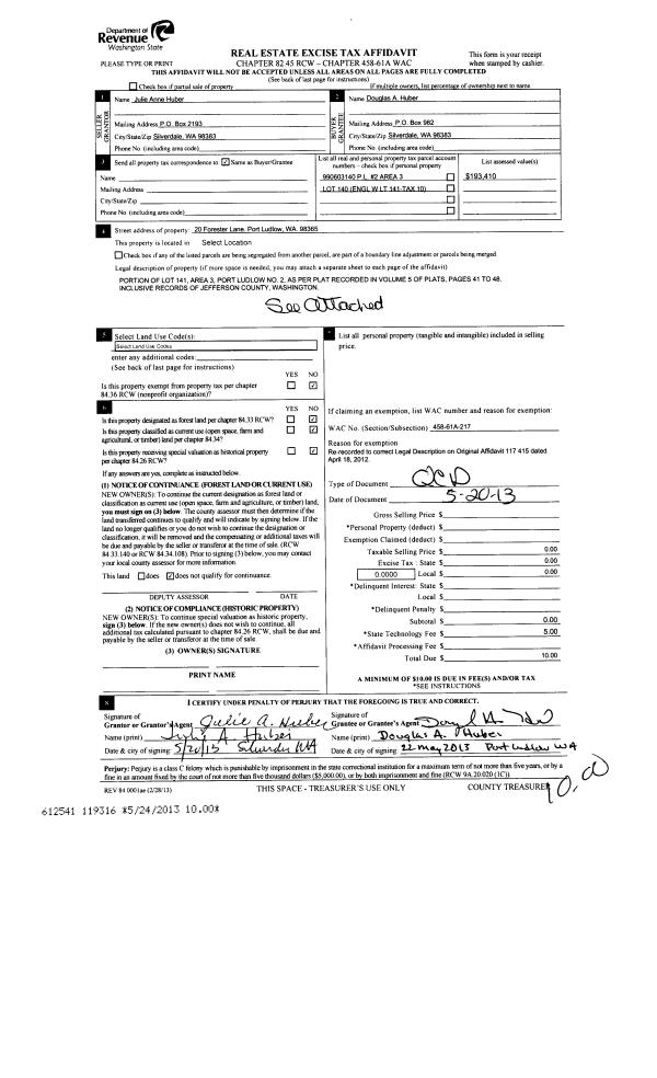 | 1 | 05/20/2013 | QCD | Quit Claim Deed | JULIE ANN HUBER | DOUGLAS A HUBER | | | | 119316 | |