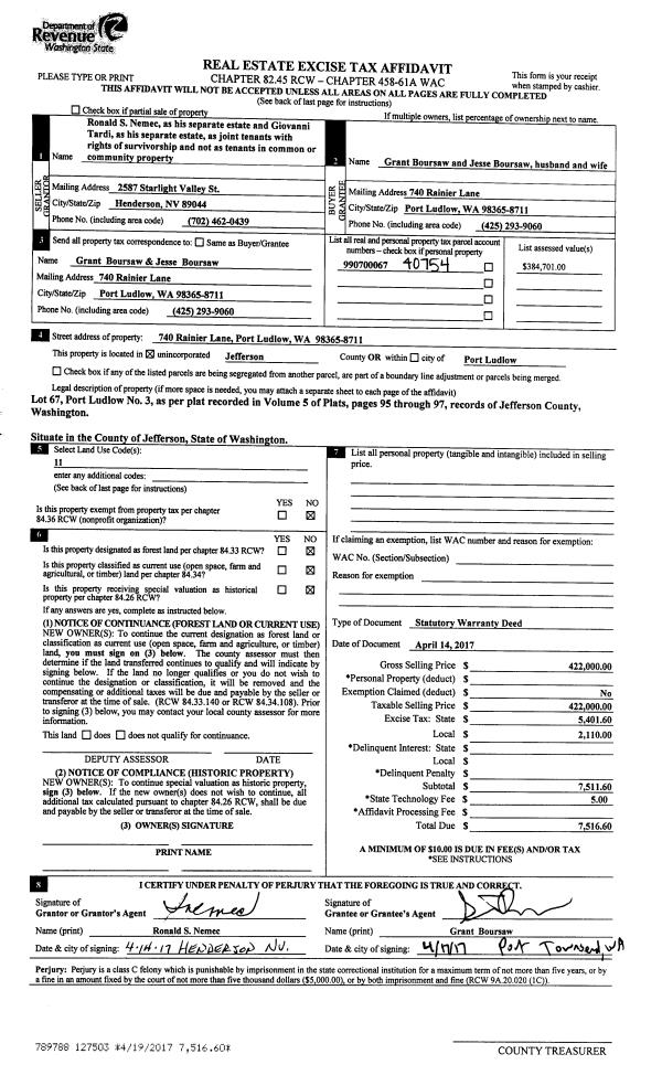 | 1 | 04/14/2017 | SWD | Statutory Warranty Deed | RONALD S NEMEC | GRANT & JESSE BOURSAW | | | $422,000.00 | 127503 | |