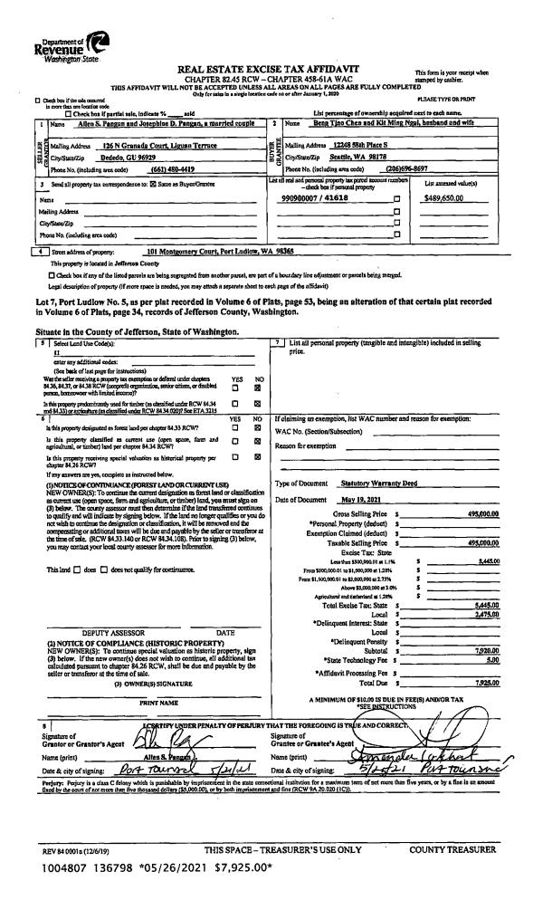 | 1 | 05/19/2021 | SWD | Statutory Warranty Deed | ALLEN & JOSEPHINE PANGAN | BENG TJAO CHEN & KIT MING NGAI | | | $495,000.00 | 136798 | |