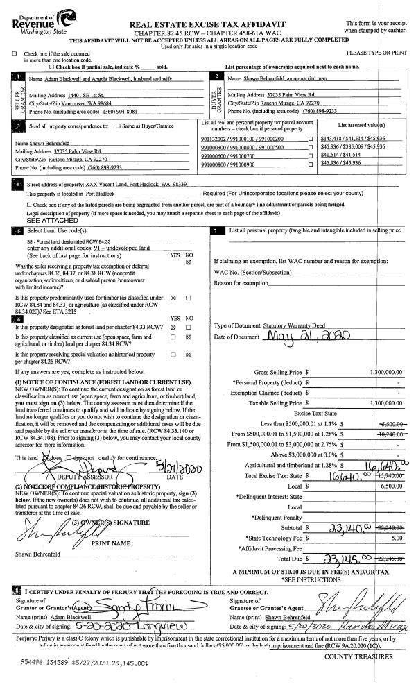 | 1 | 05/21/2020 | SWD | Statutory Warranty Deed | ADAM BLACKWELL | SHAWN BEHRENFELD | | | $1,300,000.00 | 134389 | |