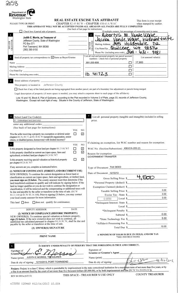 | 3 | 12/10/2013 | TXD | Tax Deed | JEFFERSON COUNTY | ROBERTUS M & JACOBA VANDEWEGHE | | | $4,500.00 | 120460 | |
