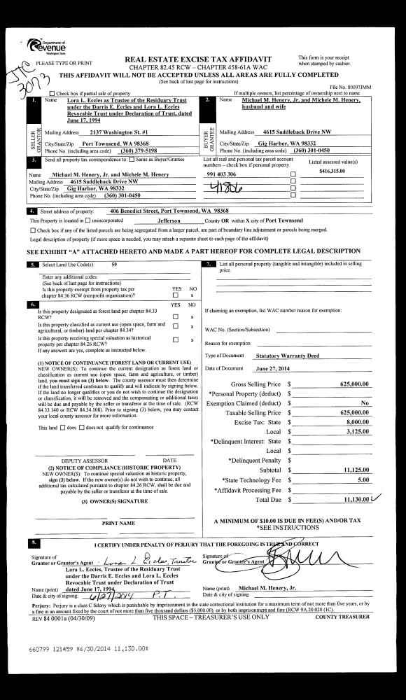 | 1 | 06/27/2014 | SWD | Statutory Warranty Deed | LORA L ECCLES TRUSTEE | MICHAEL M JR & MICHELE M HENERY | | | $625,000.00 | 121459 | |