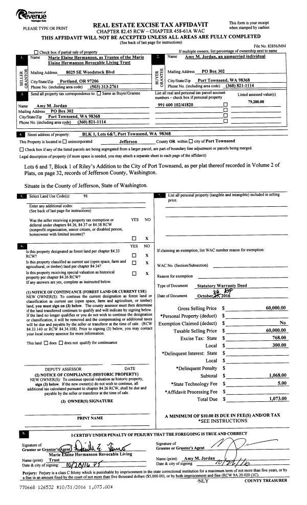 | 1 | 10/26/2016 | SWD | Statutory Warranty Deed | MARIE HERMANSON TRTEE | AMY M JORDAN | | | $60,000.00 | 126532 | |