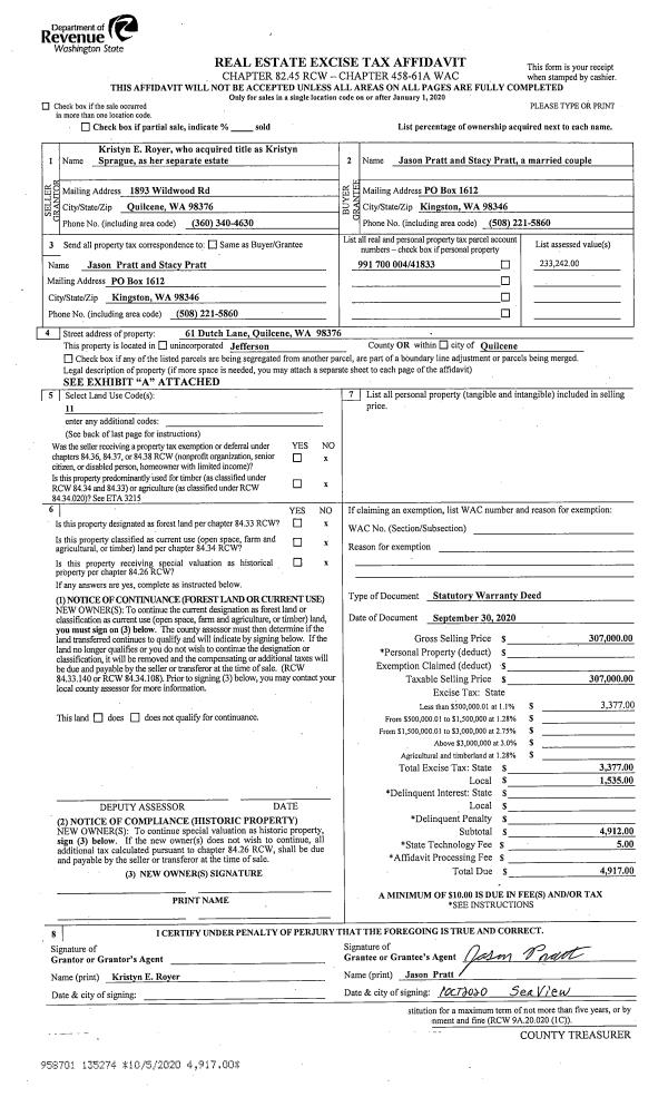 | 1 | 09/30/2020 | SWD | Statutory Warranty Deed | KRISTYN SPRAGUE | JASON & STACY PRATT | | | $307,000.00 | 135274 | |