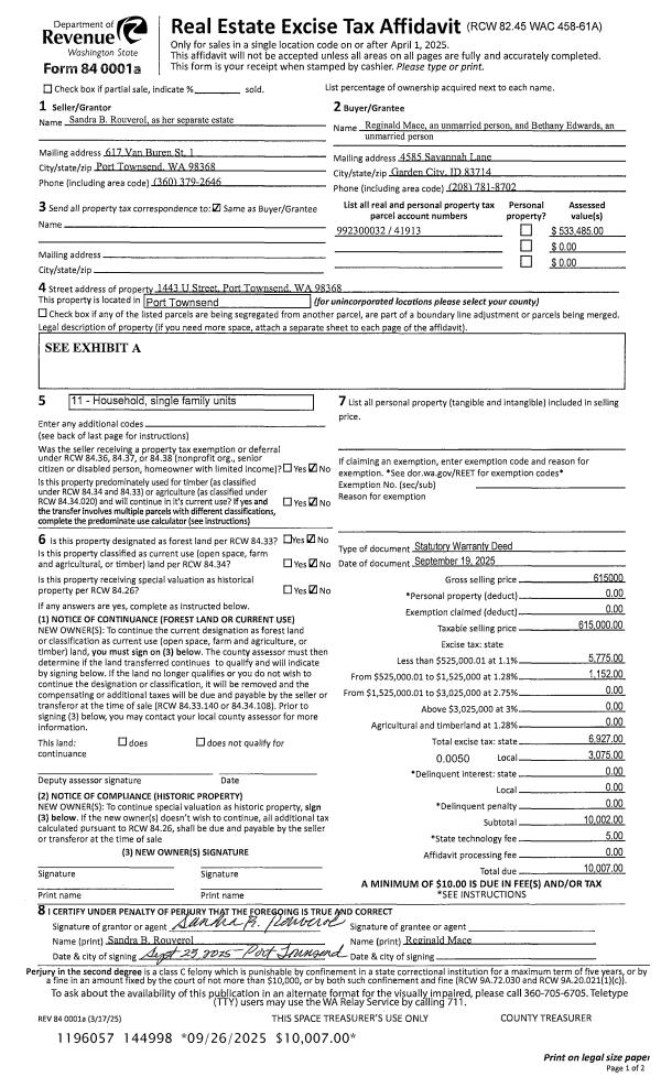 | 1 | 09/19/2025 | SWD | Statutory Warranty Deed | SANDRA B ROUVEROL | REGINALD MACE | | | $615,000.00 | 144998 | |