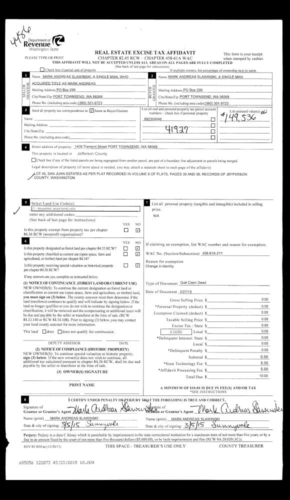 | 1 | 02/27/2015 | QCD | Quit Claim Deed | | | | | | 122873 | |