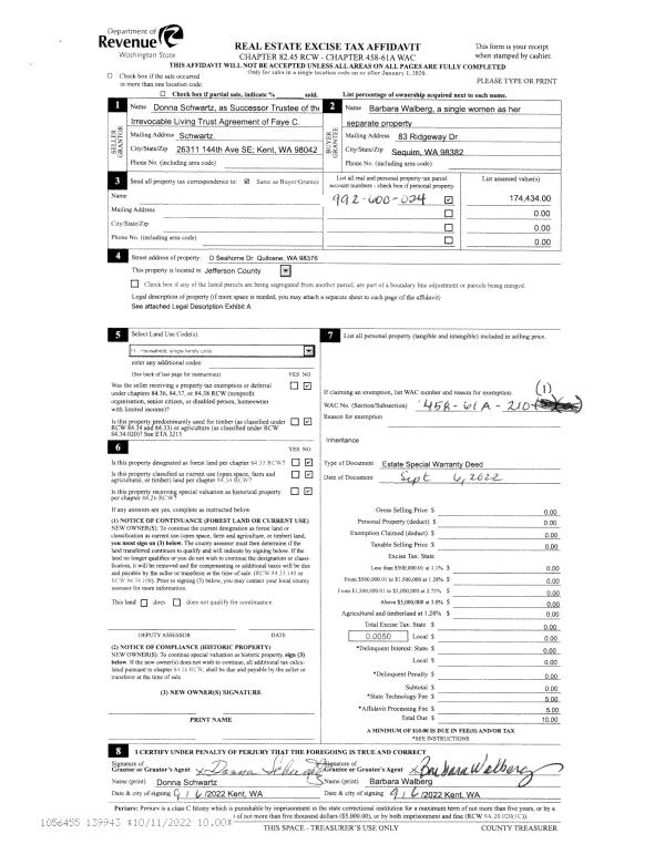 | 1 | 09/06/2022 | SPWD | Special Warranty Deed | FAYE C SCHWARTZ TRUSTE | BARBARA WALBERG | | | | 139943 | |