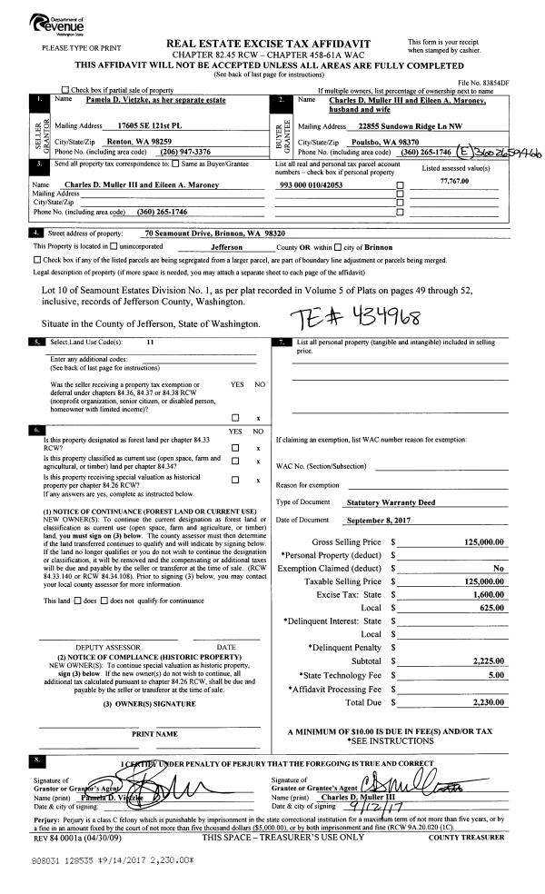 | 3 | 09/08/2017 | SWD | Statutory Warranty Deed | PAMELA VIETZKE | CHARLES MULLER III & EILEEN MARONEY | | | $125,000.00 | 128535 | |
