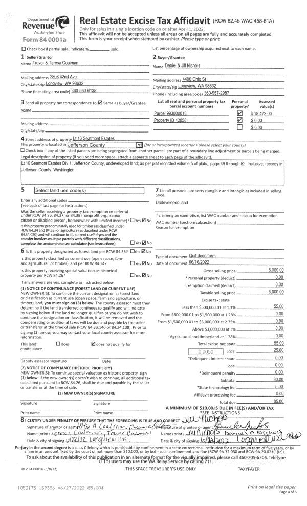 | 1 | 06/16/2022 | QCD | Quit Claim Deed | TREVOR & TERESA COALMAN | DANIEL & JILL NICHOLS | | | $5,000.00 | 139356 | |