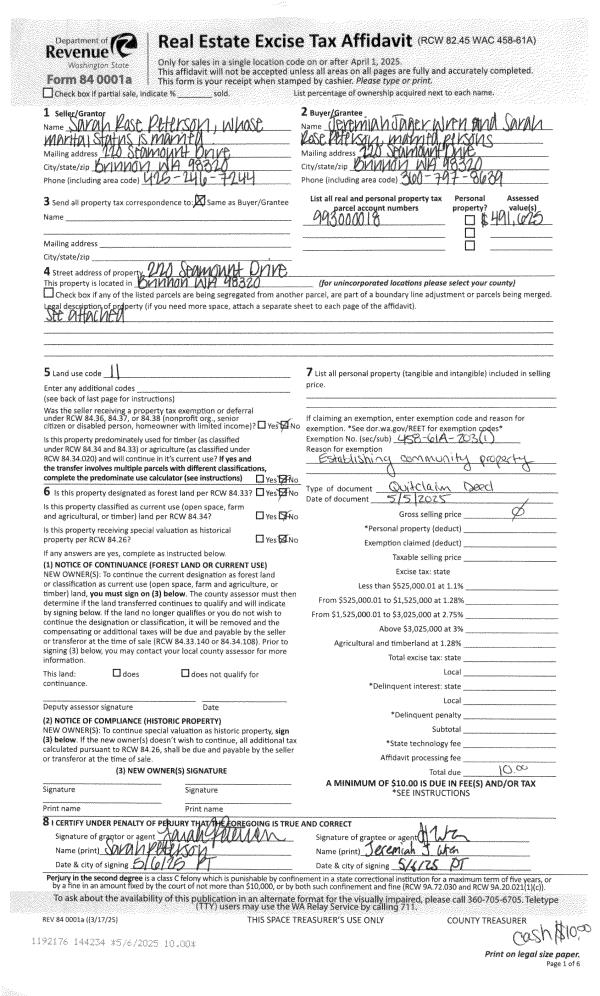 | 1 | 05/05/2025 | QCD | Quit Claim Deed | SARAH PETERSON | SARAH R PETERSON | | | | 144234 | |