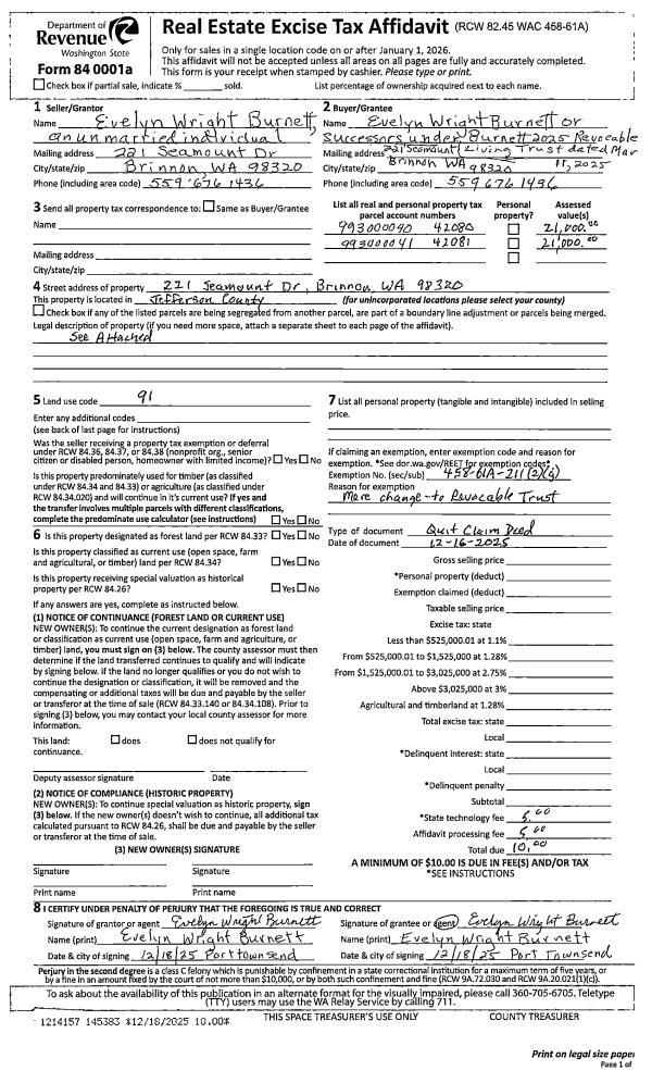 | 1 | 12/16/2025 | QCD | Quit Claim Deed | EVELYN W BURNETT | BURNETT 2025 REV LIV TRUST | | | | 145383 | |