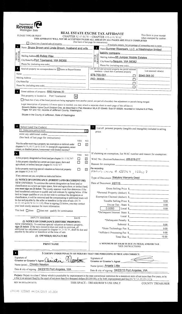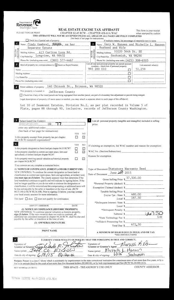 | 1 | 06/09/2015 | SWD | Statutory Warranty Deed | CINDY GAMBREL | GARY W & MICHELLE L HANSEN | | | $37,500.00 | 123332 | |