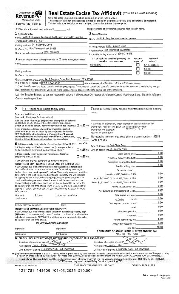 | 1 | 01/28/2026 | QCD | Quit Claim Deed | RICHARD RUGGLES TRSTEE | JUDITH A RUGGLES | | | | 145558 | |