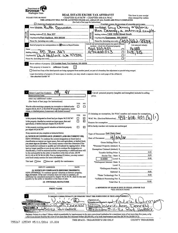| 1 | 04/22/2016 | QCD | Quit Claim Deed | VIRGINIA R DONOVAN | ROBERT GUY & VALERIE A DENNEY | | | | 125349 | |