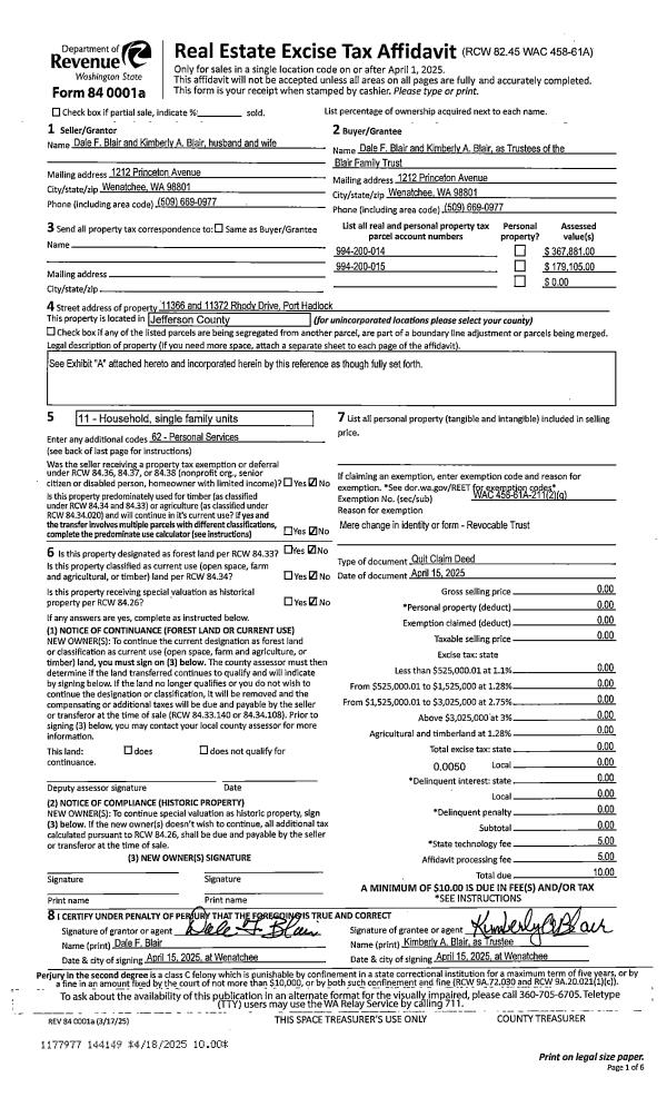 | 1 | 04/15/2025 | QCD | Quit Claim Deed | DALE F BLAIR | BLAIR FAMILY TRUST | | | | 144149 | |