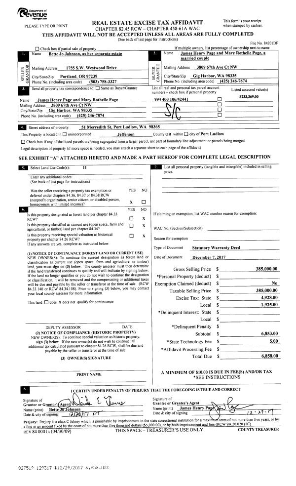 | 1 | 12/07/2017 | SWD | Statutory Warranty Deed | BETTE JO JOHNSON | JAMES HENRY PAGE | | | $385,000.00 | 129317 | |