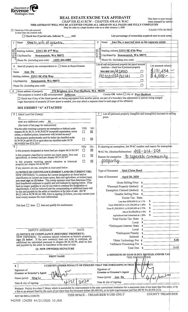 | 1 | 04/20/2020 | QCD | Quit Claim Deed | | | | | | 134258 | |