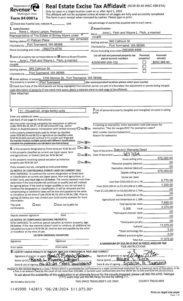 | 1 | 06/27/2024 | SWD | Statutory Warranty Deed | SHIRLEY MYERS | JONA L & WAYNE L FITCH | | | $675,000.00 | 142815 | |