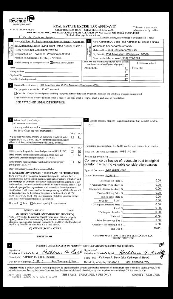| 3 | 01/27/2015 | QCD | Quit Claim Deed | KATHLEEN BECK TRUSTEE | KATHLEEN A BECK | | | | 122600 | |
