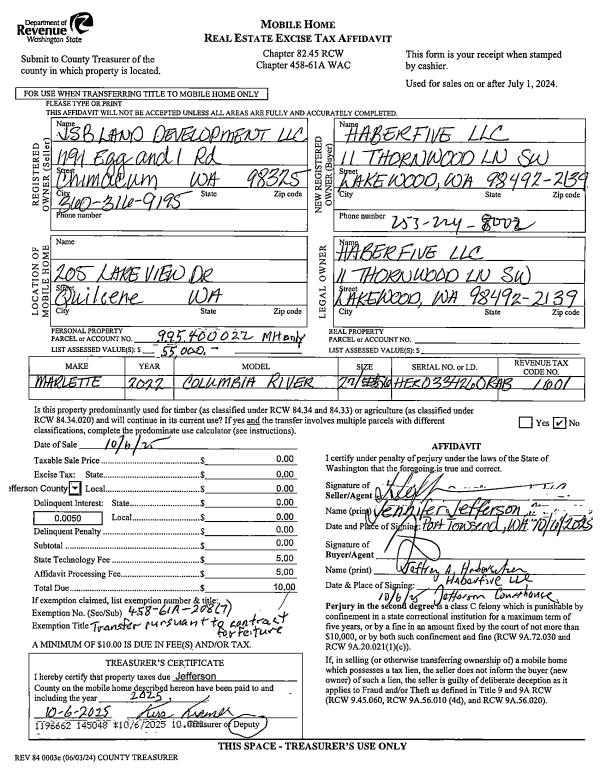 | 2 | 10/06/2025 | MH | Mobile Home | JSB LAND DEVELOPMENT LLC | HABERFIVE LLC | | | | 145048 | |