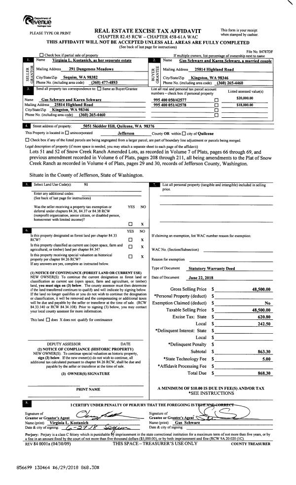 | 1 | 06/22/2018 | SWD | Statutory Warranty Deed | DONALD J KOSTANICH | GUS & KAREN SCHWARZ | | | $48,500.00 | 130464 | |