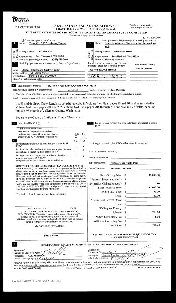 | 2 | 12/30/2014 | SWD | Statutory Warranty Deed | G P MIDDLETON TRSTE | JAMES & SHELLY MARLOW | | | $12,000.00 | 122484 | |