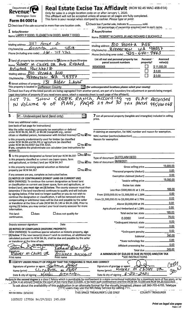 | 1 | 06/09/2021 | QCD | Quit Claim Deed | LARRY P DODD | ROBERT M CAIRES JR | | | $15,000.00 | 137026 | |