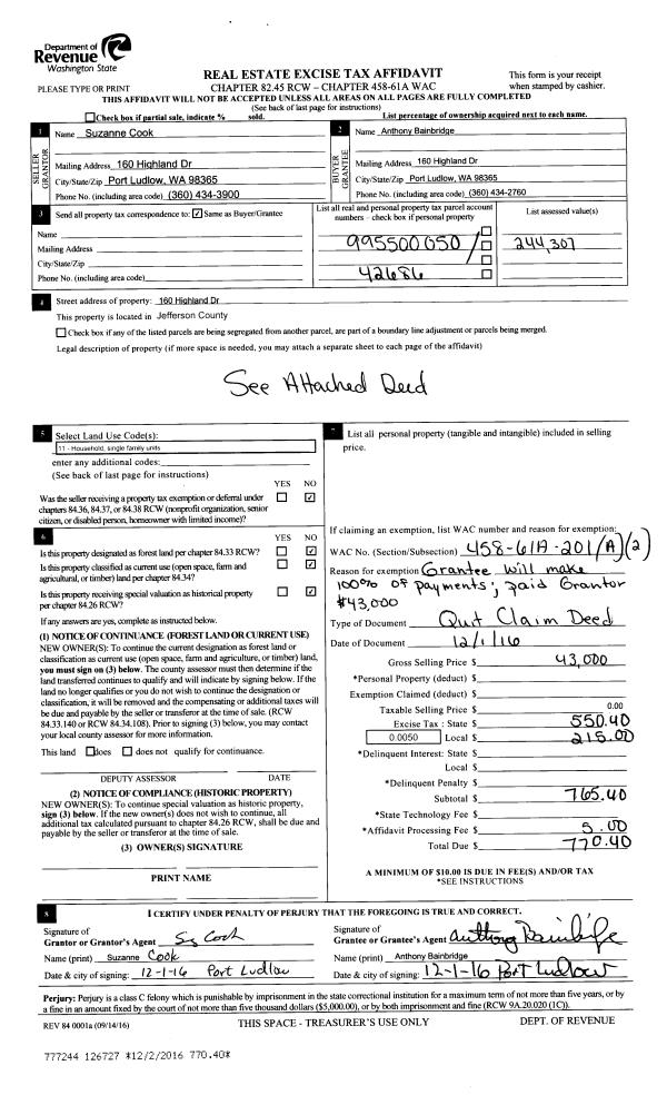 | Mailing Address: | 160 HIGHLAND DR PORT LUDLOW, WA 98365 | % Ownership: | 100.0000000000% |